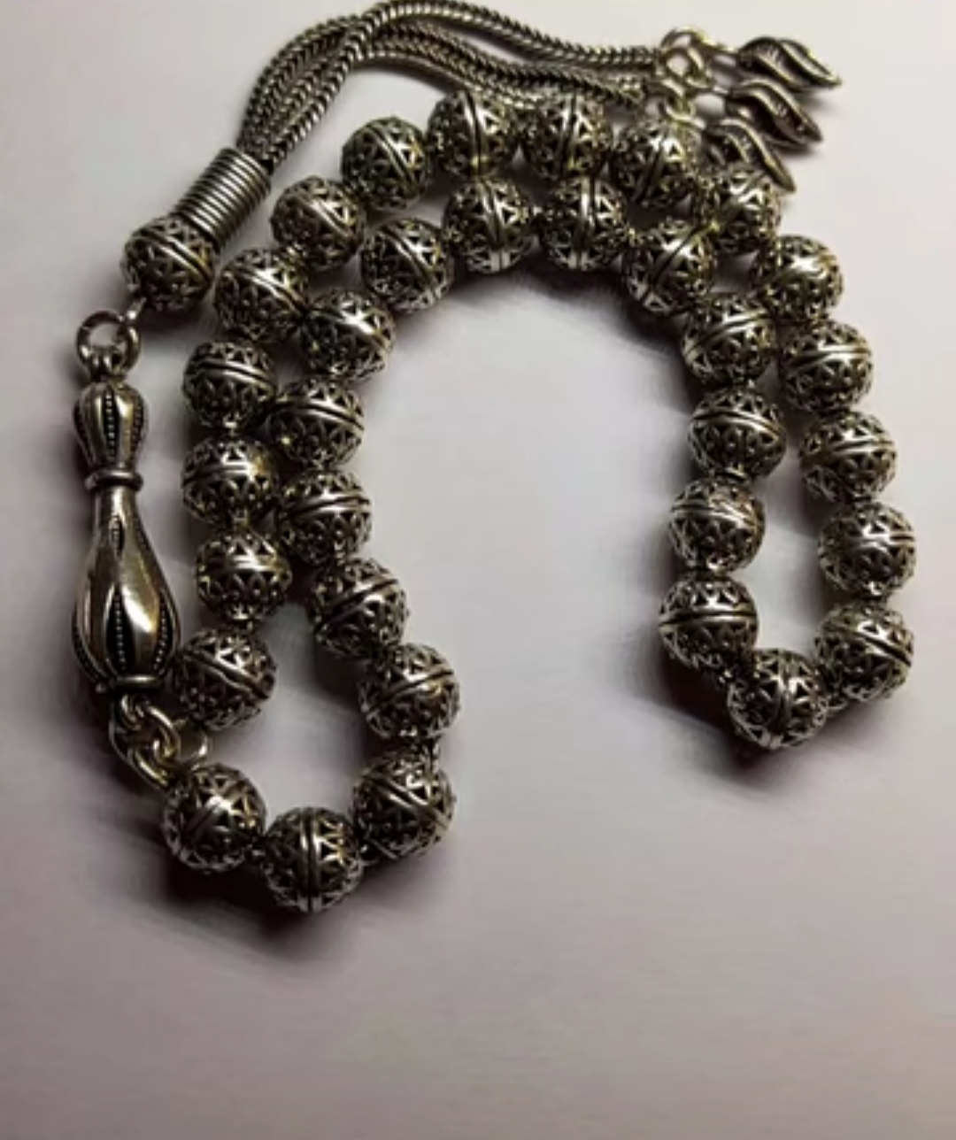 - سُبْحَة مَصْنُوعَة مِنْ أَفْخَرِ أَنْوَاعِ الفِضَّة،مَعَ شَهَادَة تُثْبِتُ أَصَالَةَ الفِضَّةِ